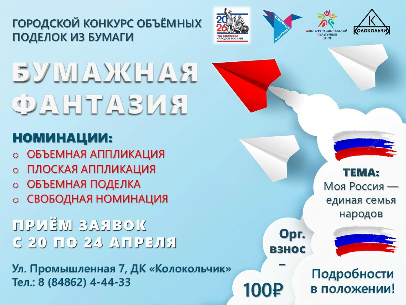 « Все Мероприятия Это мероприятие прошло. Конкурс «Бумажная фантазия» Апрель 20 - Апрель 24 р100 события Навигация « Читакль «Дневник моей мамы» Хореографический спектакль «Остров Буян» » Положение городского конкурса объёмных поделок из бумаги «Бумажная фантазия» 2026 + Календарь Google+ Экспорт в iCal Подробности Начало: Апрель 20 Окончание: Апрель 24 Стоимость: р100 Место проведения ДК «Колокольчик» ул.Промышленная, д.7 Жигулевск, Самарская область Российская Федерация
