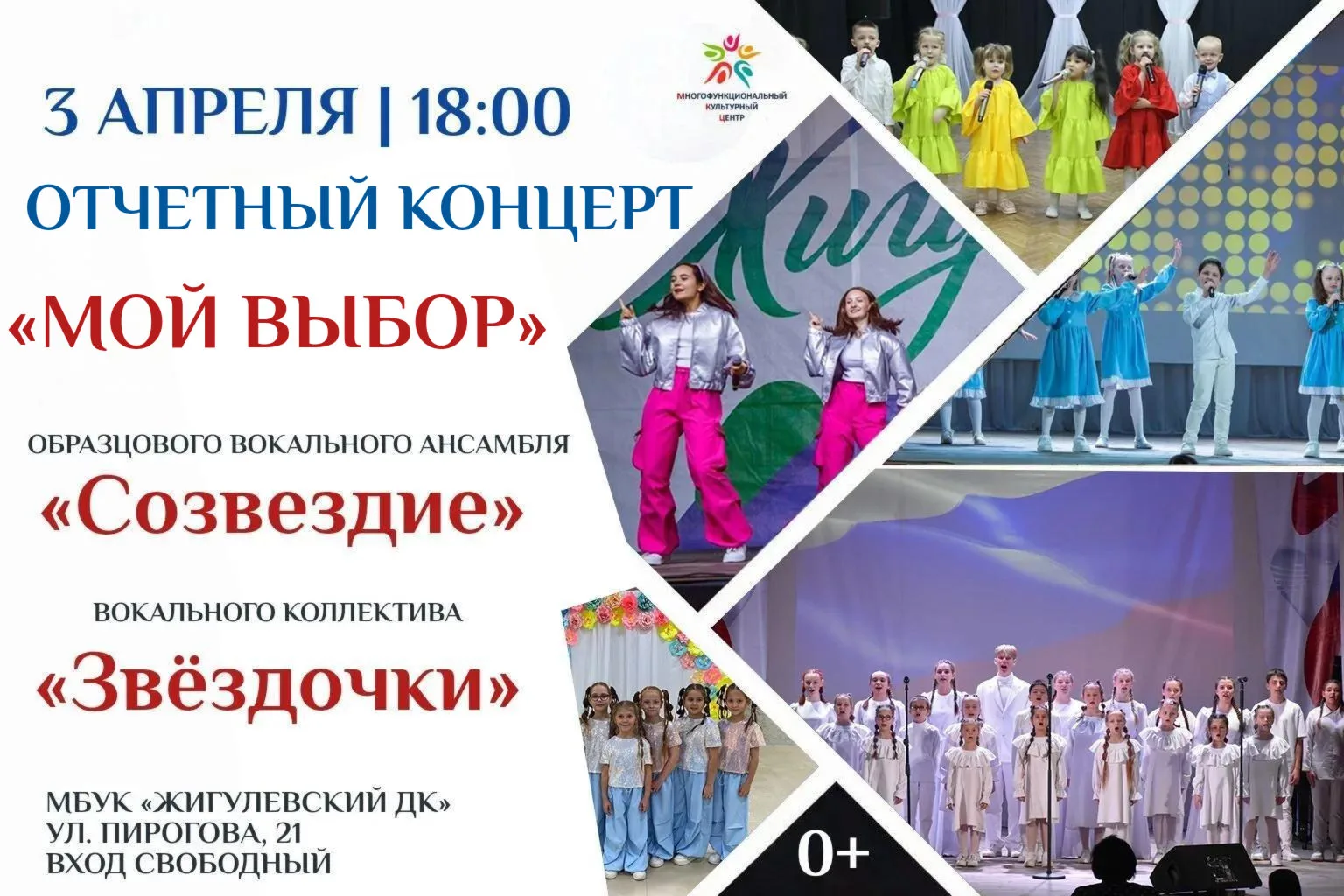 Образцовый вокальный ансамбль «Созвездие» и вокальный коллектив «Звёздочки» (рук. Ермилина Ю.А.) представляют отчетную концертную программу «Мой выбор». Мероприятие пройдет на сцене МБУК «Жигулевский ДК» (ул. Пирогова, 21).